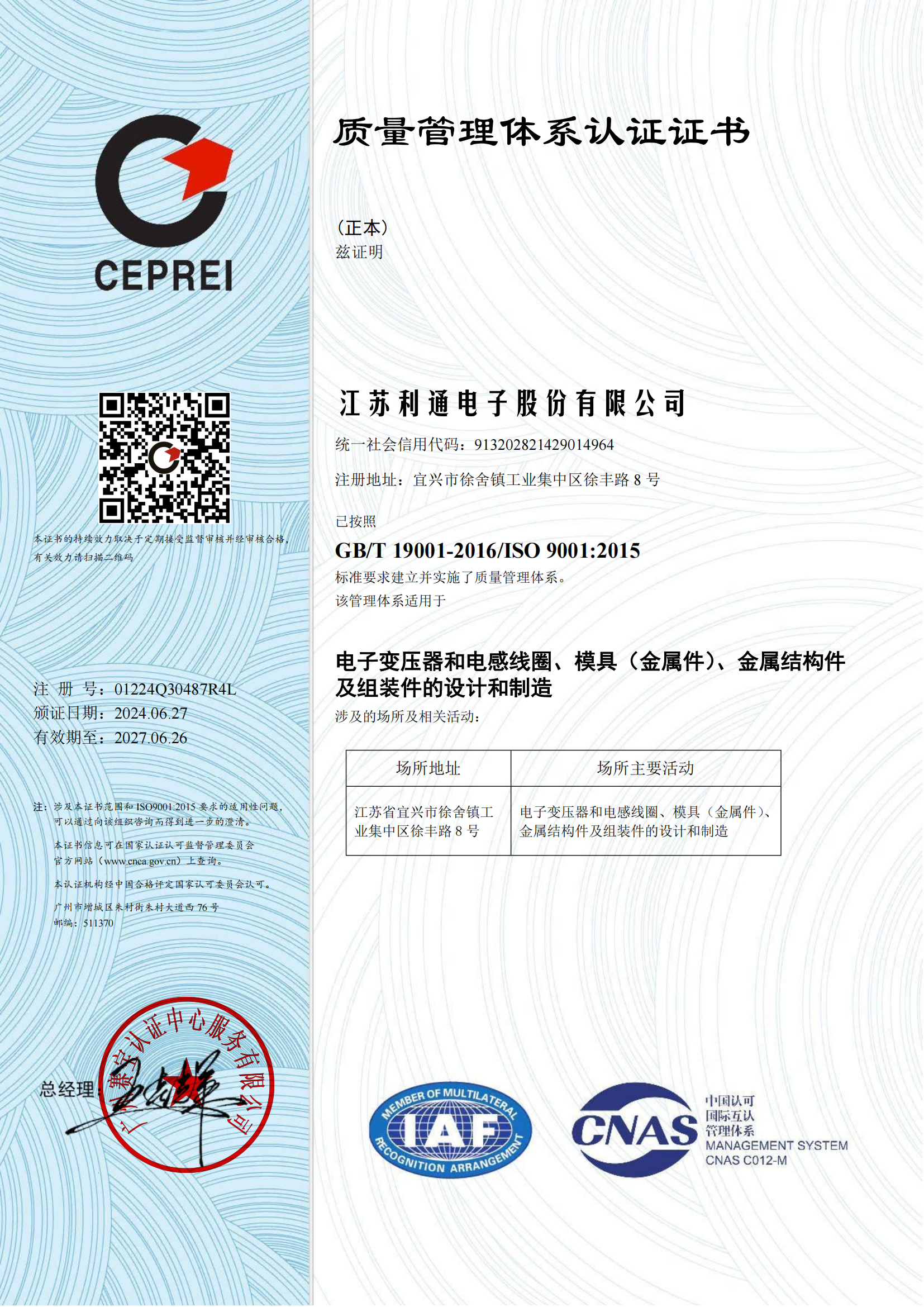 质量管理体系认证证书