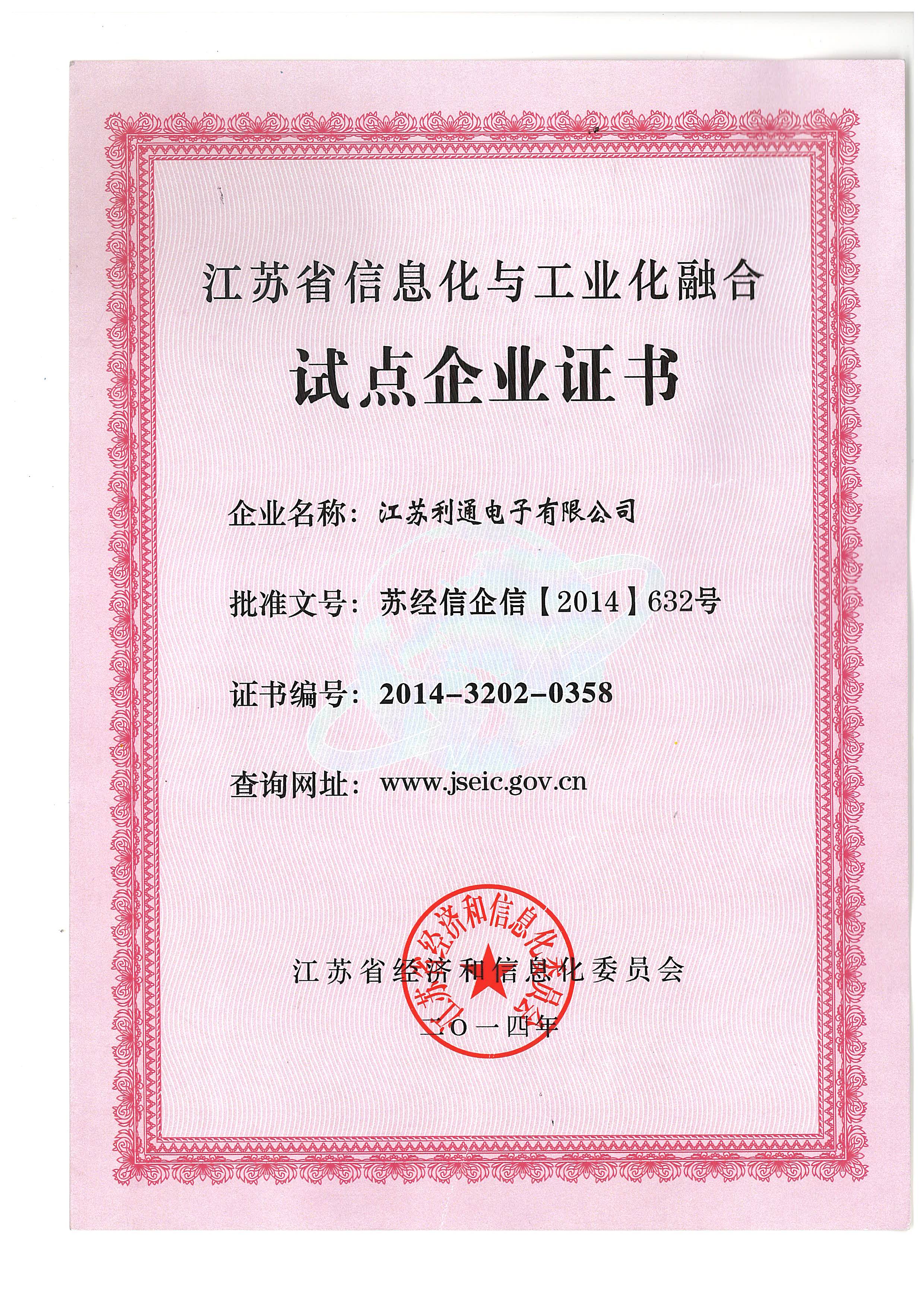 江苏省信息化与工业化融合试点企业证书